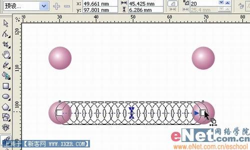 4、用椭圆工具画一个椭圆作为新路径。用交互式调和工具选中珍珠,在属性栏上点“新路径”,鼠标会变成弯曲的箭头状。
