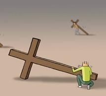 第一幅漫画中,每个人都背负着一个沉重的十字架,在缓慢而艰难地前行!