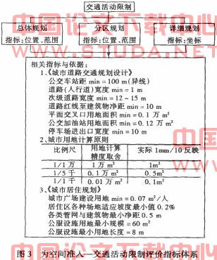 评价体系均以统一标准的位置(坐标)、高程、面积三种几何物理量作为评价指标。无缝镶嵌于数字城市空间管治信息分类体中。图3为空间准人评价指标体系之一—交通活动限制评价指标体系。